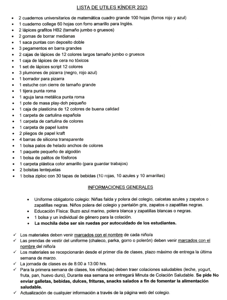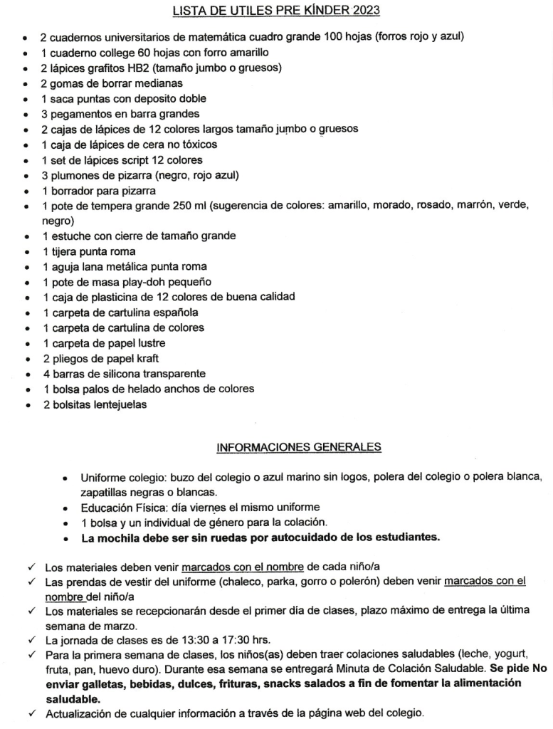 Lista de útiles escolares Pre-Básica 2023